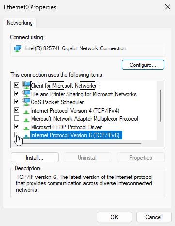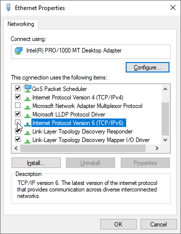 4. Disable "Internet Protocol Version 6 (TCP/IPv6)" and press OK.