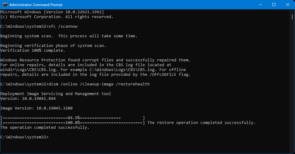 <figure><img src="https://2163635389-files.gitbook.io/~/files/v0/b/gitbook-x-prod.appspot.com/o/spaces%2FlT4oo06dNP3aOVxQqDD9%2Fuploads%2Fgit-blob-024d100676a1191524875892afbe0a8e6c7bdee1%2Fsfcdism.png?alt=media" alt=""><figcaption><p>That's how command prompt should look after both sfc and dism finished.</p></figcaption></figure>