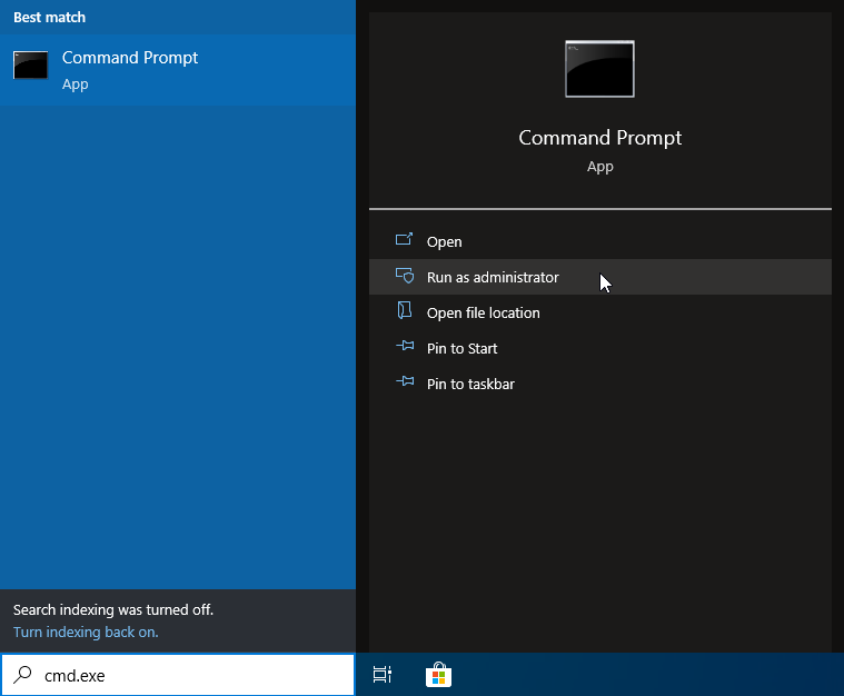 <figure><img src="https://2163635389-files.gitbook.io/~/files/v0/b/gitbook-x-prod.appspot.com/o/spaces%2FlT4oo06dNP3aOVxQqDD9%2Fuploads%2Fgit-blob-b69bd36cefbd84a35e7e78e8d79a272825c75699%2Fcmd.png?alt=media" alt="" width="563"><figcaption><p>Type <code>cmd.exe</code> in search and press "Run as administrator".</p></figcaption></figure>