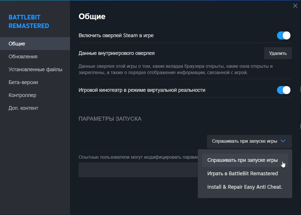 <figure><img src="https://27621656-files.gitbook.io/~/files/v0/b/gitbook-x-prod.appspot.com/o/spaces%2Fc9kot0Xe26oO8FizD4c9%2Fuploads%2Fgit-blob-36ef14de3a916ce57771027adf48292097e59113%2Faskwhenstarting.png?alt=media" alt="" width="563"><figcaption><p>Выберите вкладку "Общие" и под заголовком "ПАРАМЕТРЫ ЗАПУСКА" выберите "Спрашивать при запуске игры".</p></figcaption></figure>