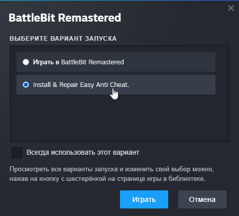 Выберите вариант запуска "Install & Repair Easy Anti Cheat".
