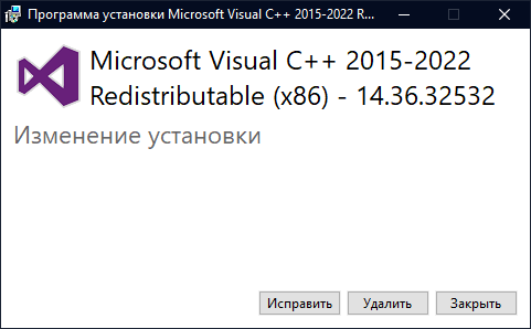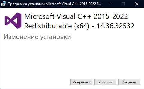 Убедитесь, что **оба** пакета VCRedist установлены правильно - [x86](https://aka.ms/vs/17/release/vc_redist.x86.exe) и [x64](https://aka.ms/vs/17/release/vc_redist.x64.exe). Когда вы запустите установщик, вы должны увидеть 3 кнопки - "Исправить", "Удалить" и "Закрыть". Если вы их не наблюдаете - продолжайте установку.