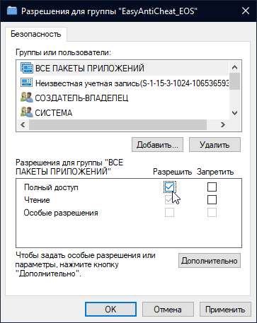 2. Выдайте EAC полный доступ для всех пакетов приложений в реестре.