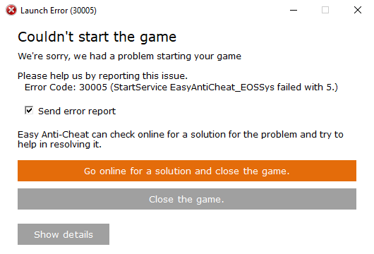 # Ошибка запуска - StartService EasyAntiCheat\_EOSSys failed with 5.